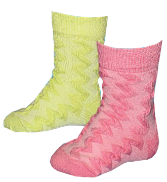 Носки для девочек с рельефным зигзагообразным переплетением по всей длине. 85%х\б + 12%па + 3%эл. Расцветки разные. В упаковке 40 штук одного размера. Цена указана за упаковку. При изменении размера цена изменяется. Модель представлена в двух вариантах расцветок - цветное ассорти и белые.